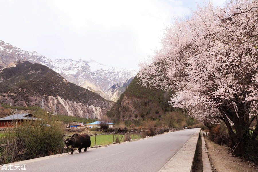 沿途乡村,桃花,雪山,溪流,一路风景。