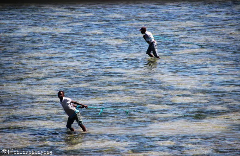 桥两边的海滩上,一些当地人在捕鱼、捡贝壳。