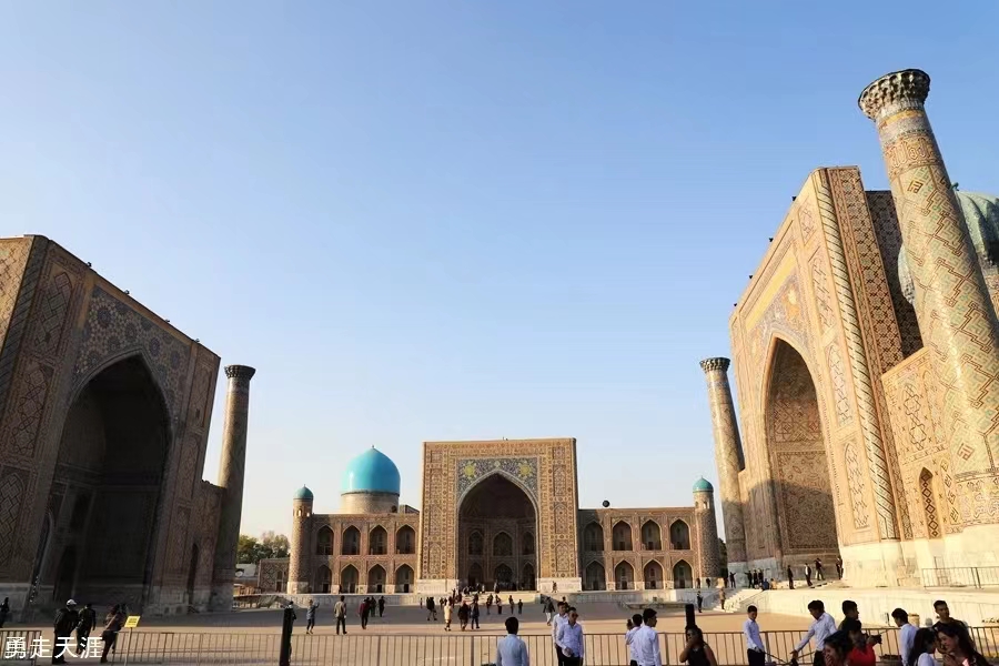 撒马尔罕古城(丝绸之路最重要的重镇)。参观帖木儿家族陵墓(陵墓造型壮观,色彩鲜艳,有球锥形大圆顶,具有浓厚的东方建筑特色,是世界著名的中亚建筑瑰宝),比比努清真寺(比比―哈内姆大清真寺在当时被认为是东方最雄伟的建筑,黄金学院。
