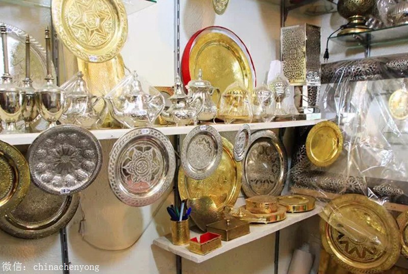 看到摩洛哥工匠正在敲打铜盘