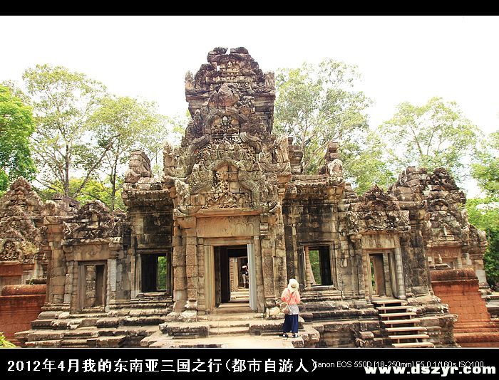 | Thommanon 托玛农神庙 它位于吴哥王城胜利门外北侧约70米,周萨神庙的北侧。12世纪建造,印度教风格,供奉湿婆和毗湿奴。与周萨神庙的建筑形式完全一样,位置也相对称,两座寺庙建于同一时期,虽然它很独特,但只是对周萨神庙的补充而已。主寺是十字形,旁边有图书馆,围墙上的大门很精美,像一座小寺一样。 ![]() |
