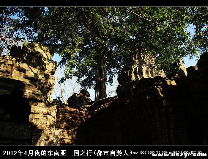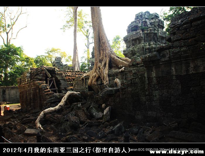 整个寺庙就像要被丛林吞噬了似的,坍塌的建筑和围墙被粗壮而巨大的树根所缠绕,盘根错节的巨树缠绕着佛塔、跨骑在围墙的两侧,让人感受到大自然的力量如此可畏。 有一种说法是,植物的果实被鸟吃掉后,种子没有被完全消化掉,鸟落在建筑上排泄,粪便落在了石缝中,种子就生根发芽长成了大树。在这种地方气候很适合植物生长,时间长了,就形成了这种奇妙的景致。几百年的古树和几百年的古建筑相存,你中有我、我中有你。但是这种平衡最终会被打破:如果任由巨树生长,寺庙迟早会被大树所分解、压垮;而强行分开也必然树亡寺毁。这成了保护工作一个大大的难题。 |