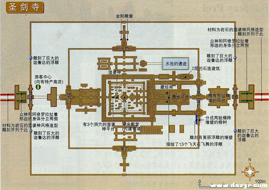 圣剑寺门前有一条大道, 大道两边都有一排石柱。石柱是方形的,有柱头和柱身,柱头四周雕刻有佛龛,中间的佛像已经没有了。有的柱头已经掉了下来,有的分成了两半放在一边。 下面的柱身装饰有伽鲁达(伽鲁达Garuda,它是鸟头人身的神兽,中国名字叫“鸟人”,传说伽鲁达是毗湿奴的坐骑) |