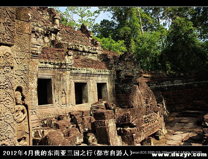 站在一片乱石堆上,俯视全寺:倒塌的走廊和碎石、笔挺的树干、布满青苔的石塔,精美的石柱、石窗和小仙女雕刻,由于在丛林中没有多少阳光,整个建筑都显的很阴暗--------这是凄凉的美。 |