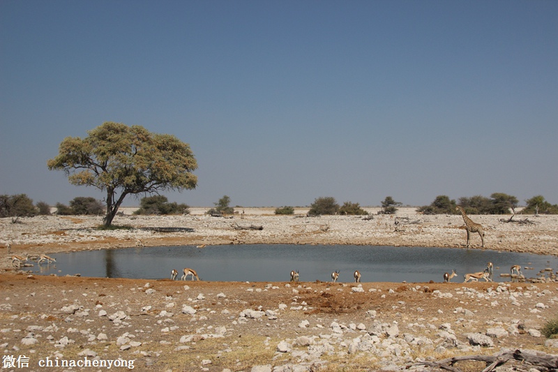 埃托沙(Etosha)在当地语言中意思是“白色干水之地”,其实就是个长130公里,宽50公里,面积达四百八十平方公里的巨大的盐沼。