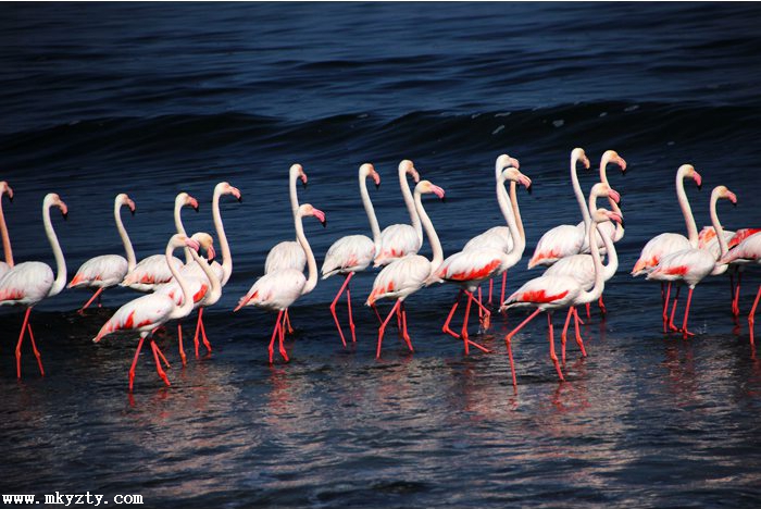 旁边还有一大群火烈鸟。步伐一致朝一个方向。