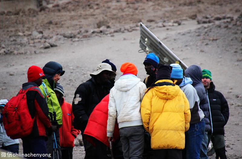 快到4700米的营地时,我走路开始有点晃来晃去,向导把我搀扶了一段。抵达营地,终于可以休息了。正准备回到房间去,突然看到门口一群人。一个人平躺在输送小车上,原来是韩国父亲,他正要被往山下运输。---希望他没事。我进到房间里,倒头就睡,2个小时后,等到韩国女孩登顶下来,才起来。这个时候,终于稍微恢复体力。