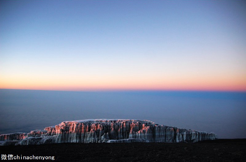就这样,艰难行走了6个小时多,终于看到乞力马扎罗山顶峰。天边一道霞光非常漂亮。