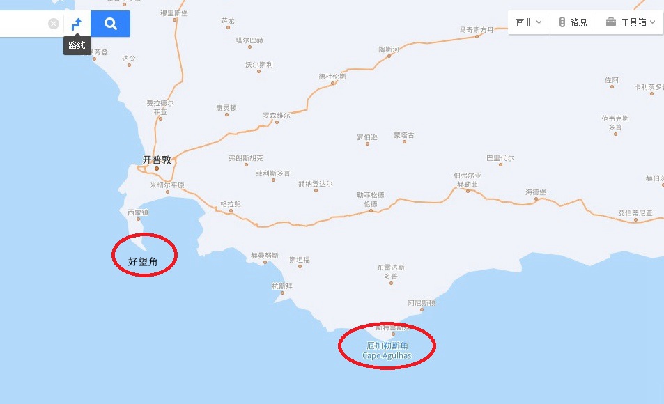 这里是非洲大陆的天涯海角,也是大西洋与印度洋的地理分界线。我的左面是印度洋,我的右面是大西洋。