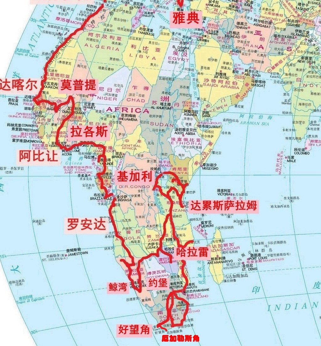 将“好望角”误为“非洲大陆最南端”是历史的错误。1487年8月,葡萄牙航海家迪亚士从里斯本出发,沿非洲西海岸南行,于次年2月3日停泊在非洲南海岸的莫塞湾。归程中,在好望角遇到了狂风巨浪,误以为来到了“非洲大陆的最南端”,便给这个岬角取名“风暴角”。葡萄牙国王认为发现“风暴角”是个好征兆,因为绕过它就能通往富庶的东方,遂将其易名“好望角”。