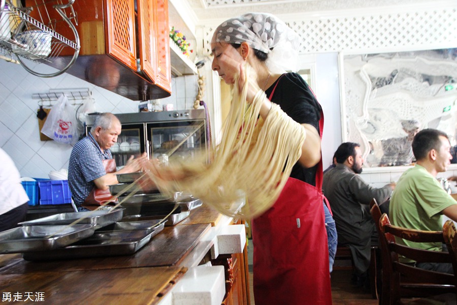 原来她们在做新疆拌面,俗称“拉条子”,因其制法独特,并拌以菜食而得名。