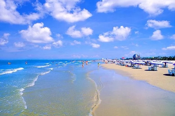 北海银滩,西起侨港镇渔港,东至大冠沙,由西区、东区和海域沙滩区组成,东西绵延约24公里,海滩宽度在30--3000米之间,陆地面积12平方公里,总面积约38平方公里。面积超过大连、烟台、青岛、厦门和北戴河海滨浴场沙滩的总和,而平均坡度仅为0.05。沙滩均由高品位的石英砂堆积而成,在阳光的照射下,洁白、细腻的沙滩会泛出银光,故称银滩。